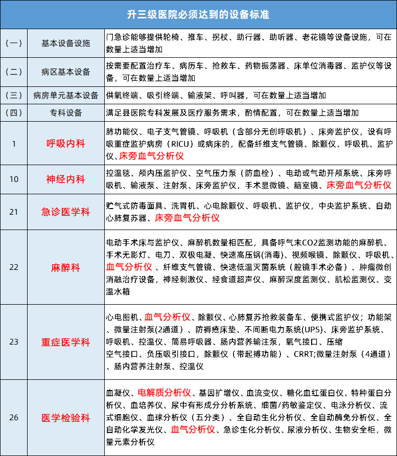 毫無(wú)疑問(wèn),在國(guó)家財(cái)政的大力支持之下,未來(lái)三年內(nèi)必將有大批縣級(jí)醫(yī)院實(shí)現(xiàn)突破晉升三級(jí)醫(yī)院,必將給大批醫(yī)療設(shè)備生產(chǎn)廠家和經(jīng)銷商帶來(lái)巨大的利好。按照官方要求,縣綜合醫(yī)院想要轉(zhuǎn)三級(jí),除必須達(dá)到國(guó)家三級(jí)綜合醫(yī)院醫(yī)療服務(wù)能力外,相關(guān)醫(yī)療設(shè)備也要達(dá)到標(biāo)準(zhǔn),官方已擬定并發(fā)表了推薦醫(yī)療設(shè)備的配置標(biāo)準(zhǔn)。其中康立生物作為血?dú)?、電解質(zhì)領(lǐng)域的專家,我司研發(fā)生產(chǎn)的產(chǎn)品也都符合眾多科室的必備需求: