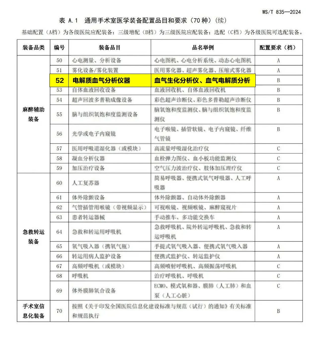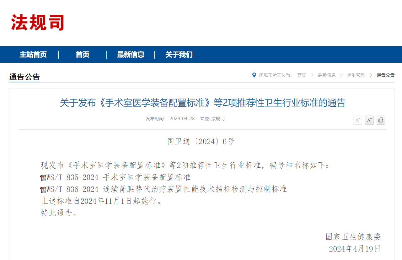 國家衛(wèi)健委2024年4月19日發(fā)布《手術室醫(yī)學裝備配置標準》推薦性衛(wèi)生行業(yè)標準,編號和名稱如下:WS/T?835-2024?。